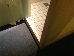 The shower cubicle opens into the room. The sink is right there in the room. And the toilet is in yet another cubicle that is so small I have to leave the door open when I pee because my knees won’t fit in.