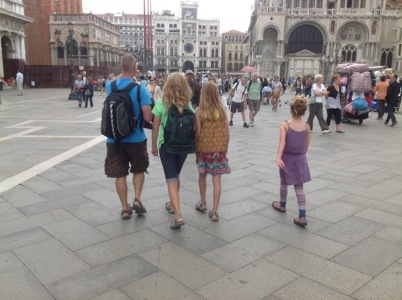 On our third day of Italian camping, we set off on a ferry from Punta Sabbioni to Venice to get back to some real Italy. Our kids begrudgingly joined us (like they had a choice). So much for their week’s respite from sightseeing, but this was small time. A half hour on a boat can hardly be called “travelling” surely. It was an overcast day, so we dragged them away from the waterpark and had a great afternoon walking around Venice, and touring the grand canal by waterbus. The boat there was fairly expensive for all five of us, so we did the freebies – Piazza St Marco, a quick look in the Basillica, the Rialto Bridge, and all the little photo ops in between. Venice has a reputation for being one of the most expensive cities in Europe, but there’s still lots you can do with a family for free.